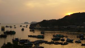 So nah an einem Naturweltwunder kann uns auch die schwerste Grippe und der beste Disney-Film nicht im Bett halten und wir machen einen Tagesausflug in die Halong und Han La Bucht. Entspannt, warm eingepackt und mit Tee gerüstet genießen wir vom Deck die zahlreichen Formationen der Bucht. Vorbei schippernd an schwimmenden Dörfern und „Affeninseln“ genießen wir den Rückweg und werden zum Abschied noch mit einem Bilderbuch-Sonnenuntergang im Hafen von Cat Ba belohnt.