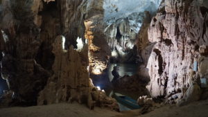 Wir übernachten im kleinen Dorf Son Trach im Phong Nha Nationalpark. Vom Flughafen sind es ca. 45 Minuten nach Son Trach. Wir genießen die Landschaft, die an uns vorbeizieht: Karstberge, Wälder, Wasserbüffel, Nebel, vereinzelt ein paar Hütten und Fahrzeuge. Hier scheint die Welt fast noch stillzustehen. Son Trach hat 3000 Einwohner, täglich besuchen ca. 600 Touristen den Ort – eine Zahl, die in den kommenden Jahren sicher steigen wird. Vor einem Jahr gab es hier nur eine Handvoll Unterkünfte, mittlerweile sind die Straßen gesäumt von Hotels, Homestays, Gasthäusern… und die Baustellen lassen nur erahnen, was die Zukunft bringen soll. Der Phong Nha Nationalpark beherbergt einzigartige Höhlenformationen, die größte Höhle der Welt, unberührten Dschungel und artenreiche Tierwelt. Zuerst war er nur Ausflugsziel für einheimische Besucher und Höhlenbegeisterte, nun öffnet sich Phong Nha dem Massentourismus.