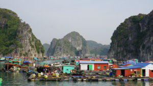 Der Weg in die Lan Ha Bucht ist gesäumt von bunten schwimmenden Häusschen.