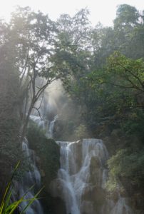 Wir haben für Luang Prabang viel auf dem Programm und leihen uns einen Roller, um alles zu schaffen. Wir fahren zum Kuang Si Wasserfall. Von allen Wasserfällen, die wir bis dato gesehen haben, ist das der Schönste. Wir laufen zur Quelle des Wasserfalls und genießen die Abkühlung und den Lauf der einzelnen Bäche. Danach fahren wir die 30 km zurück nach Luang Prabang, machen Stop an einem Restaurant mit Mekong-Blick und sind fasziniert von der Umgebung Luang Prabangs. Natur, wie wir sie mögen! Zurück in der Stadt schauen wir uns Tempel an, erklimmen zum Sonnenuntergang den heiligen Berg Phou Si und waren mit dieser Idee mal wieder nicht die Einzigen. Wir essen erneut auf dem Nachtmarkt und schlendern an den gut sortierten Ständen vorbei. Den traditionellen Bettelgang der Mönche durch die Stadt lassen wir ausfallen… laut vielen Informationen soll dieser religiöse Akt nun mehr einer Zoo-Beschau ähneln und die Touristen dem Brauch jede Würde nehmen. Davon wollen wir nicht Zeuge werden. Außerdem müssen wir unser Boot pünktlich erreichen.