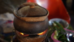 Um die Stadt zu erkunden und all die Tempel zu sehen, entscheiden wir uns wieder für die sportliche Variante der Zweiräder und radeln drauf los. Zwischendurch ein französisch angehauchtes laotisches Gebäck und weiter geht es, bis wir zum Sonnenuntergang den Mekong entlang radeln und zum Abschluss gemütlich über den Nachtmarkt schlendern. Diese Nachtmärkte begleiten uns in ganz Südostasien… die Stände bieten allerhand Produkte, die das Land oder die Tourismusindustrie hervorbringen. Wir besuchen die Märkte hauptsächlich, weil es dort das beste Essen zu finden gibt. Und wir werden auch hier fündig! Ein „Hot Pot“-Platz. Fondue auf Laos-Art. Hier werden Tonkrüge auf einer kleinen Feuerstelle am Tisch serviert. Dazu allerhand Pflanzliches und, wer mag, Tierisches. Im Tonkrug ist eine Brühe und dann ist das eigene Geschick und die Kreativität gefragt, was und wann man etwas hineintut, um es wenig später lecker herauszuholen. Hier könnten wir den ganzen Abend sitzen, Suppe löffeln, dem Treiben zuschauen und die Atmosphäre genießen.